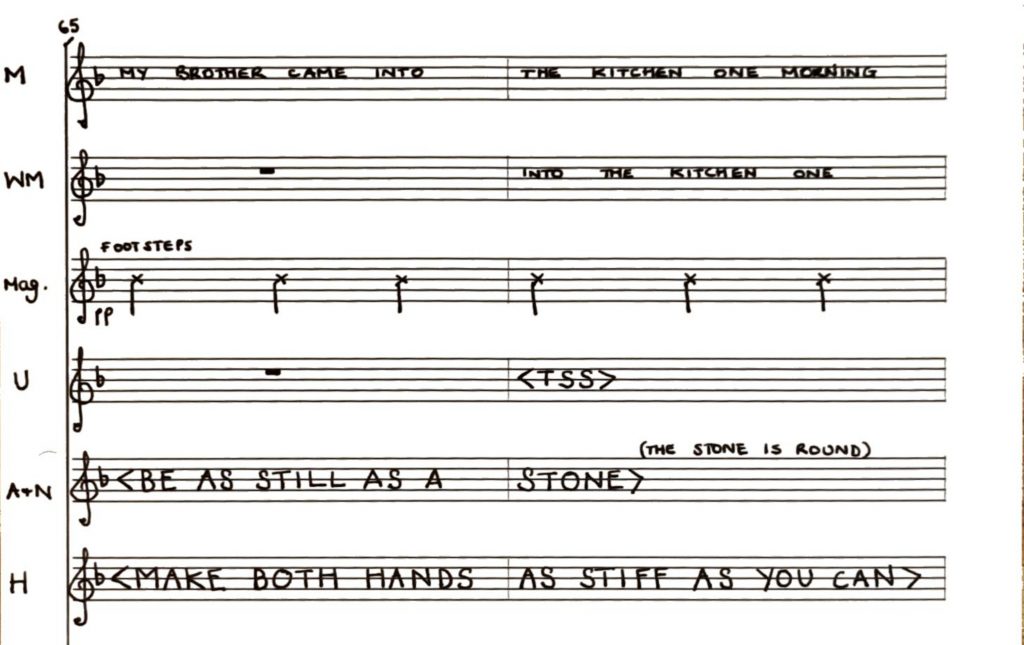 These parts began life separately with the intention of producing the environmental sound world of the piece. However, during the composition process, Magical and Unbearable have knitted themselves together in a way that hints at a maybe-maybe-not third voice. To me, my feeling is that these hands and voices are female (as I write this, I am unsure why this is), but they could be played by male performers if this is deemed to be preferable. Towards the end of the piece, the performers playing Magical and Unbearable are asked to improvise, if they so wish. The improvisations may take any form (vocal, environmental, instrumental) and I seek no control of this. As such, the performers of both parts should feel comfortable with the possibility of the improvisatory passages. The performers playing the parts of Magical and Unbearable should look upon the score as a set of timed instructions. The score does not instruct them what to say or play, it tells them what to do and think.